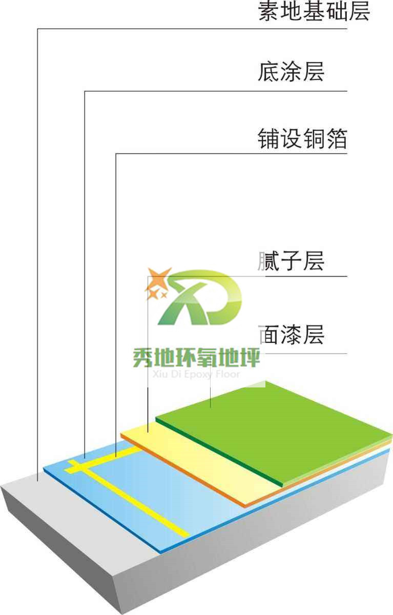 素地處理→防靜電底漆→防靜電地坪漆環靜電中涂→銅箔鋪設→防靜電地坪漆防靜電批土→防靜電地坪漆防靜電面漆→防