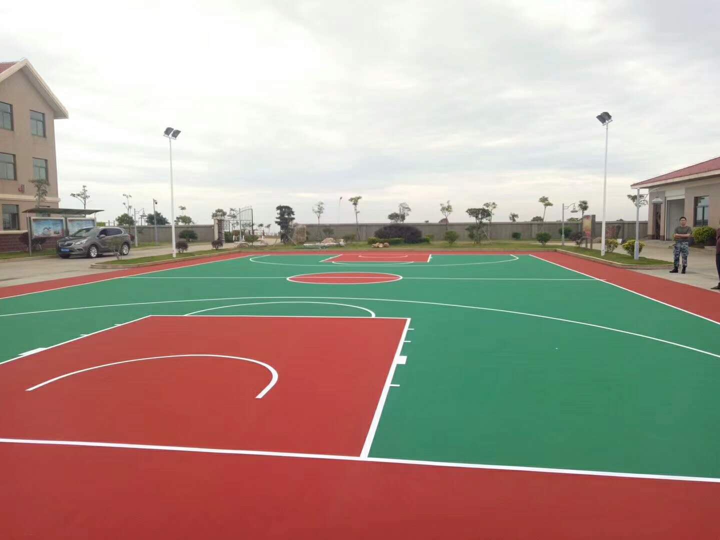 B、網球場:分三道噴涂,第一道加30%砂,第二道加20%砂,第三道不加砂。